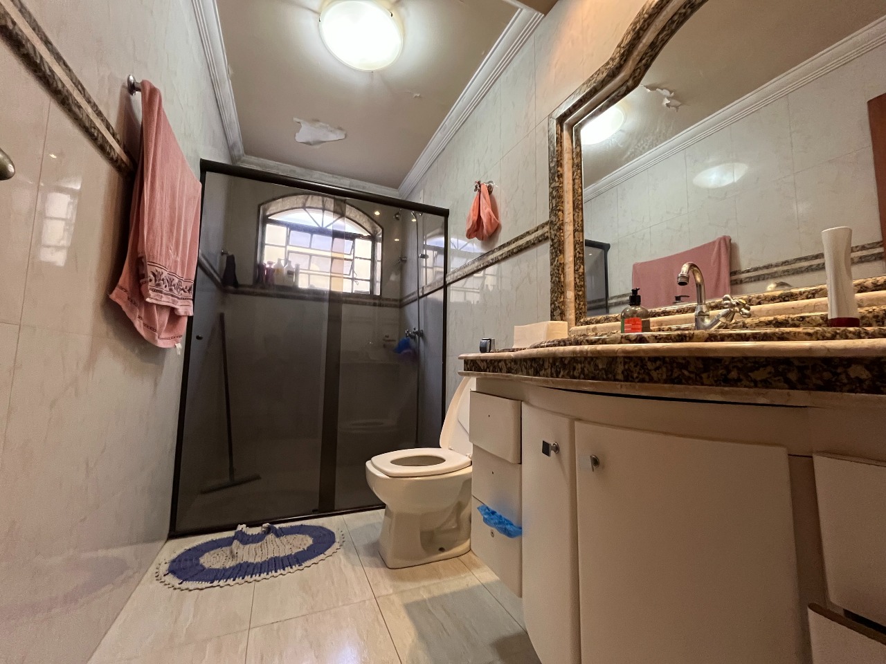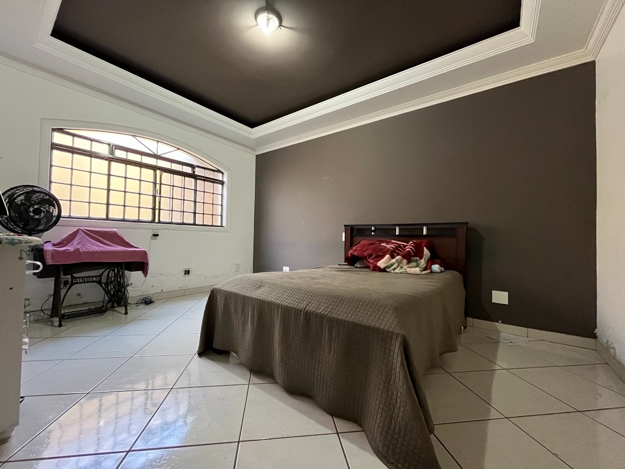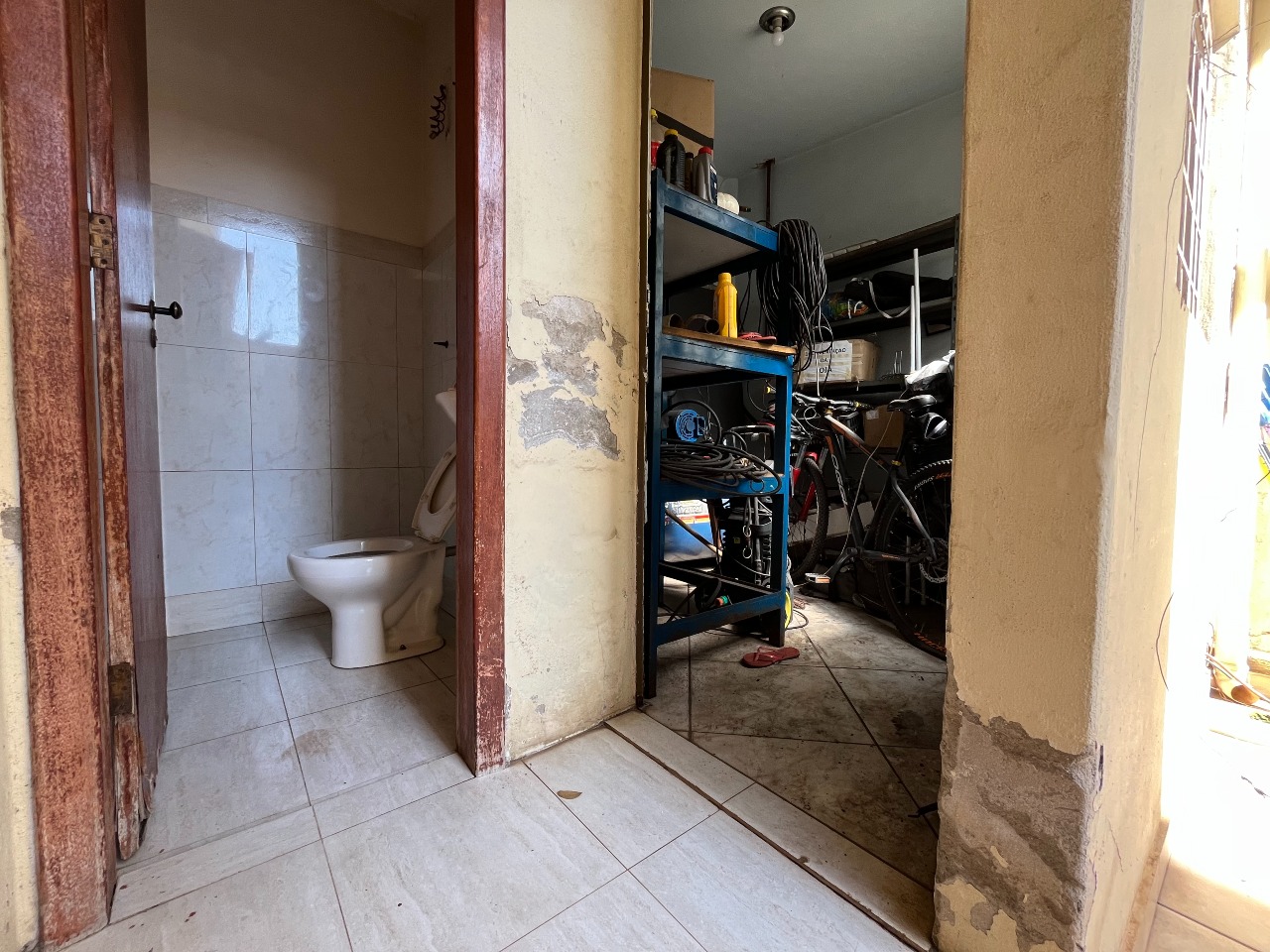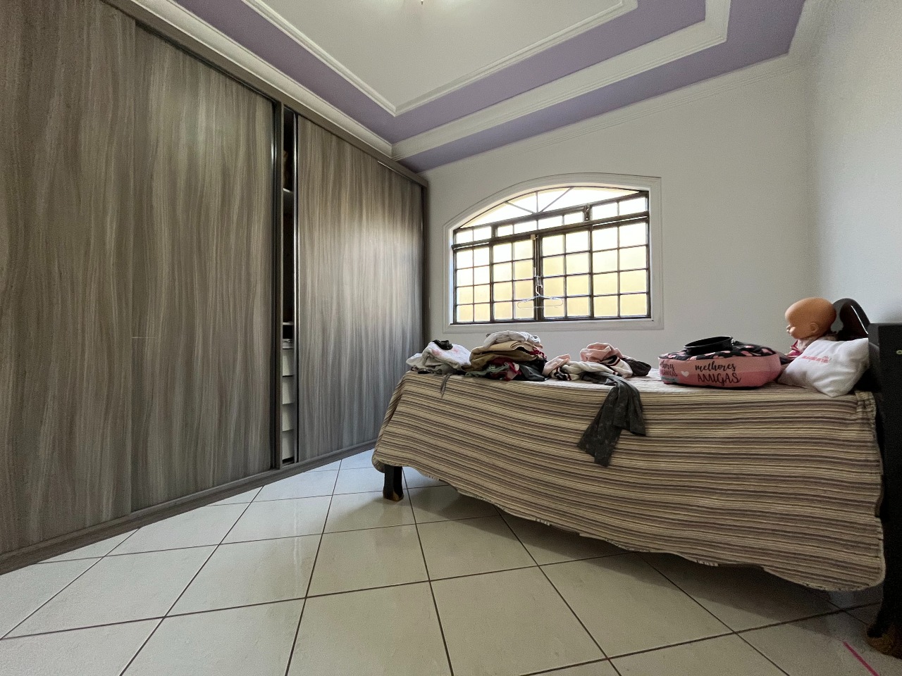 No total, são três quartos, todos com armários embutidos. A casa dispõe de uma suíte (com o banheiro ainda não finalizado) e cinco banheiros sociais adicionais.